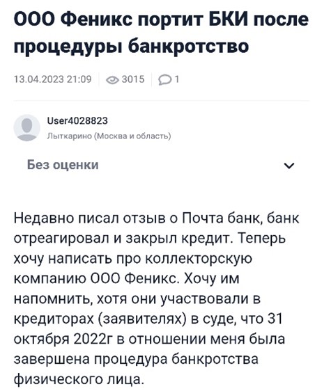• Тревожат должника в процессе или после завершения банкротства, хотя по закону это запрещено. Например, на такое нарушение пожаловался посетитель сайта Banki.ru: